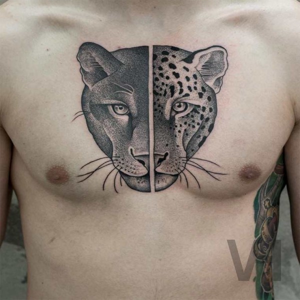 胸部雕刻风格花豹与黑豹组合头像纹身图案