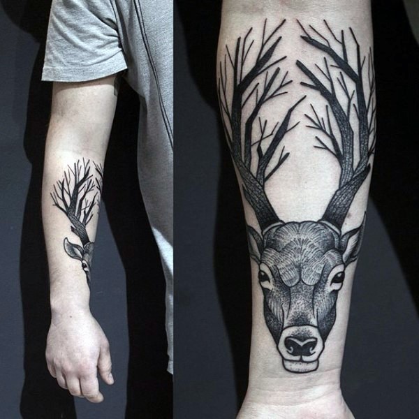 手臂黑色鹿头骨个性纹身图案