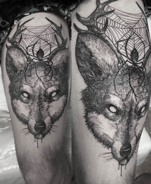 大腿雕刻风格黑色蜘蛛网和狐狸头纹身图案