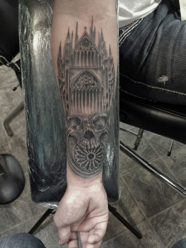 手臂黑灰风格老教堂与骷髅纹身图案