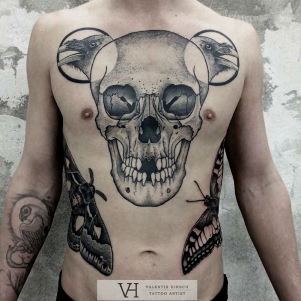 胸部经典的黑色人类骷髅与乌鸦纹身图案