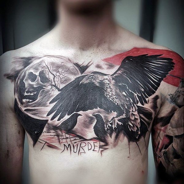 胸部壮观的黑色乌鸦月亮和字母纹身图案