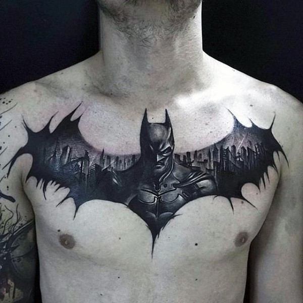 胸部华丽的黑色蝙蝠侠与徽章纹身图案