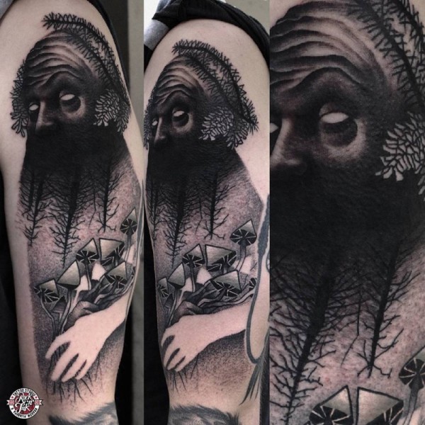 大臂超现实主义黑色男人与神秘森林纹身图案