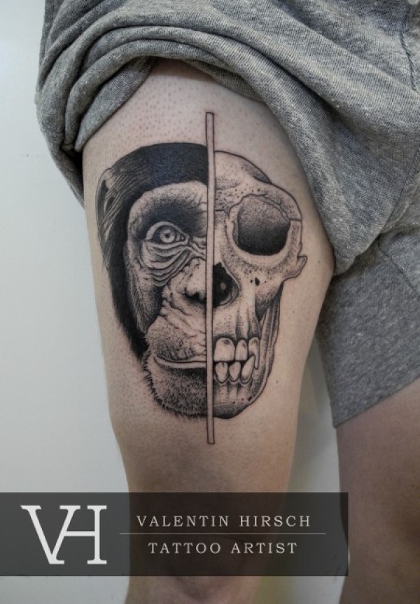 大腿雕刻风格黑色半头骨半猴子头部纹身图案