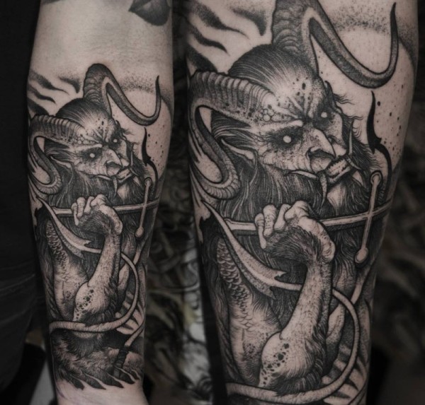 雕刻风格黑色羊角恶魔纹身图案