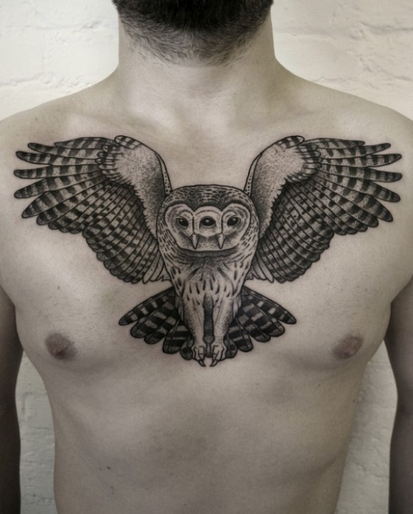 胸部惊人的黑色三眼飞行猫头鹰纹身图案