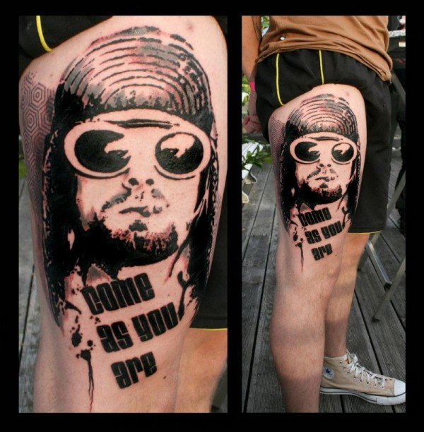 大腿黑色字母太阳眼镜和抽烟男人纹身图案