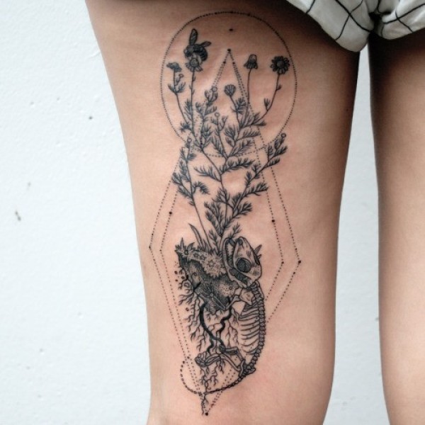 大腿雕刻风格黑色蜥蜴与植物几何纹身图案