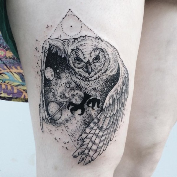 大腿雕刻风格黑色太阳系猫头鹰纹身图案