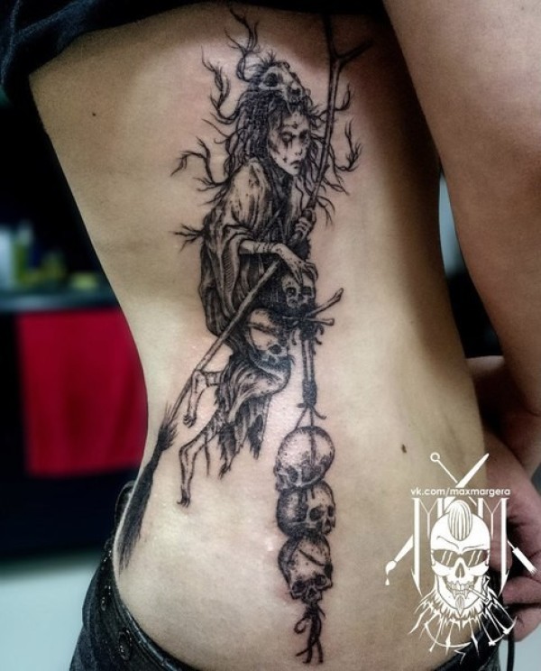 侧肋雕刻风格黑色邪恶女巫与骷髅纹身图案