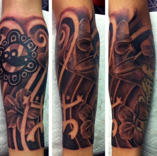 小臂黑灰风格古代符号和雕像花朵纹身图案