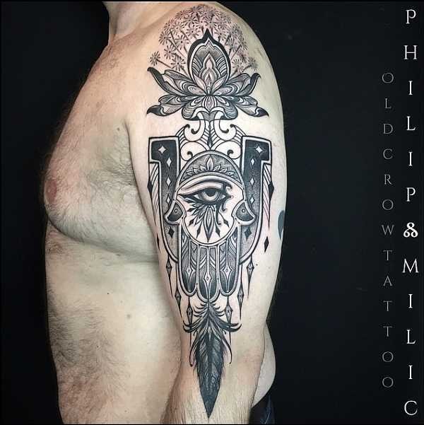 手臂黑色法蒂玛之手和羽毛花朵纹身图案