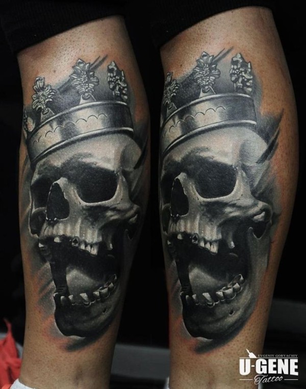 小腿灰色骷髅与皇冠纹身图案
