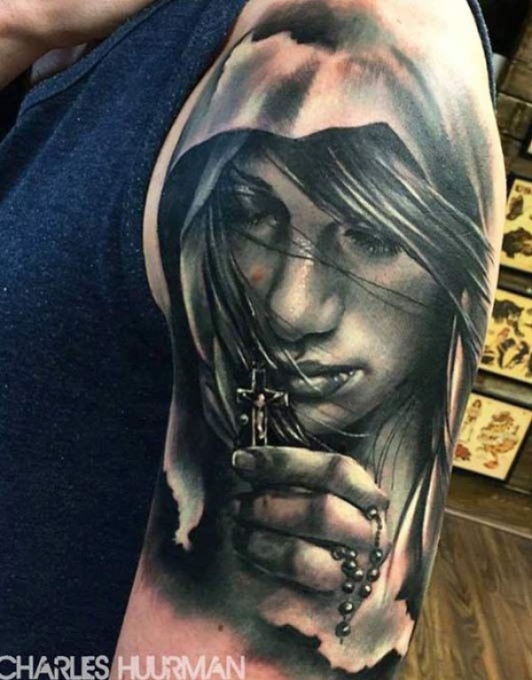 大臂逼真的黑白女人与十字架纹身图案