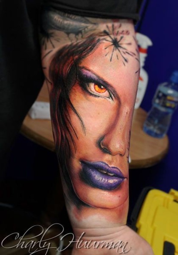 小臂引人注目的写实诱人女人肖像纹身图案