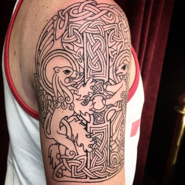凯尔特风格黑色线条十字架和狮子纹身图案