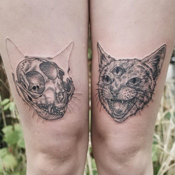 大腿可怕的黑色猫头骨与三眼猫纹身图案