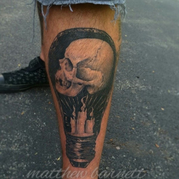 小腿雕刻风格黑色蜡烛和骷髅灯泡纹身图案