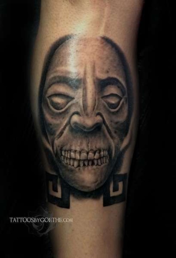 小腿黑灰可怕怪物脸纹身图案