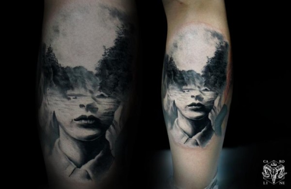 小腿黑色山地森林人像纹身图案