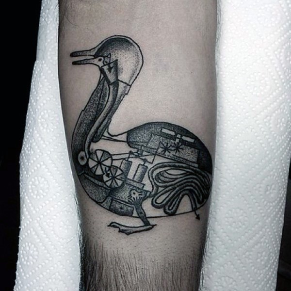 小臂点刺风格黑色机械鸭子纹身图案