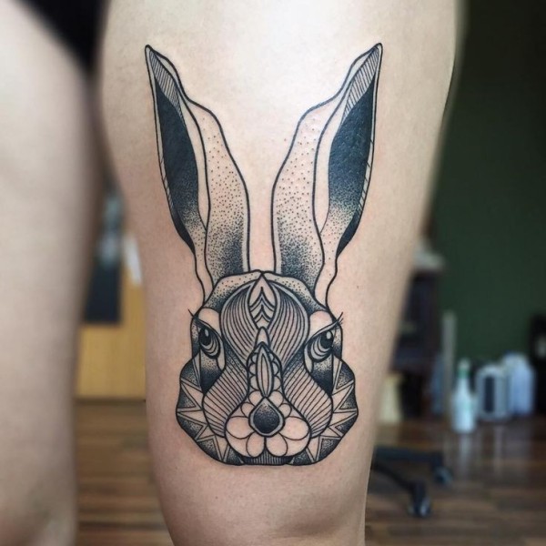 大腿雕刻风格黑白滑稽兔子纹身图案