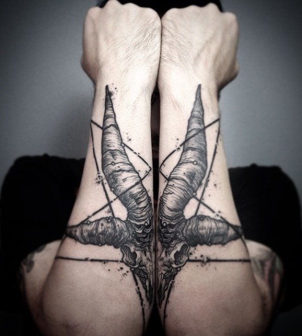 手臂雕刻风格黑色山羊头骨恶魔纹身图案