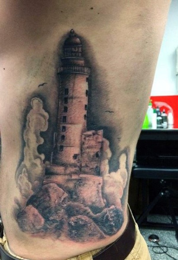 侧肋黑灰色风格灯塔与鸟类纹身图案