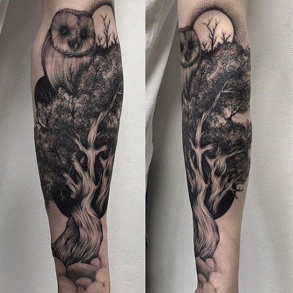 小臂雕刻风格黑色猫头鹰大树纹身图案