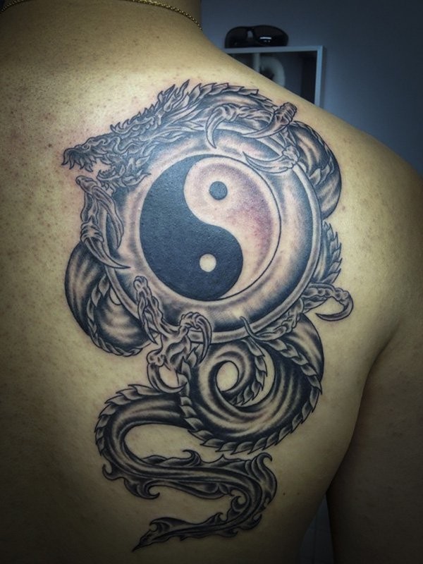肩部黑灰风格阴阳八卦与龙纹身图案