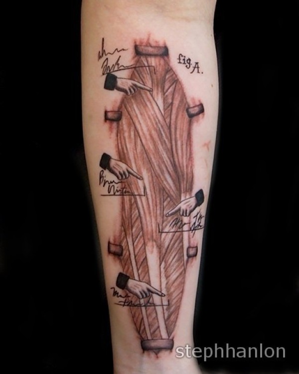 小臂黑灰风格人体肌肉与手字母纹身图案