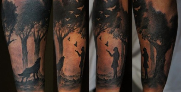 带着狼和鸟在森林里的女孩小臂纹身图案