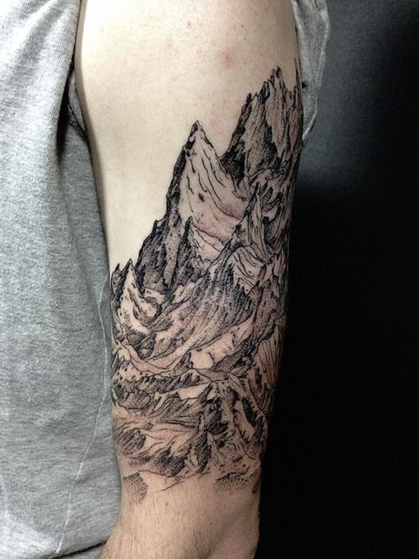 大臂雕刻风格黑色大山纹身图案