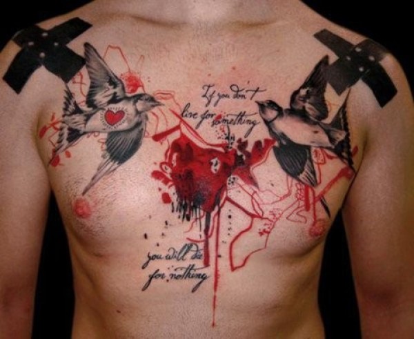 胸部红色心脏与黑色十字架小鸟纹身图案