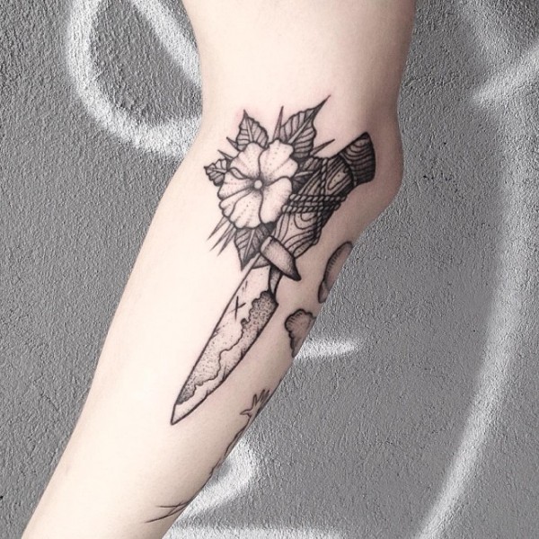 小臂雕刻风格黑色匕首与花朵纹身图案