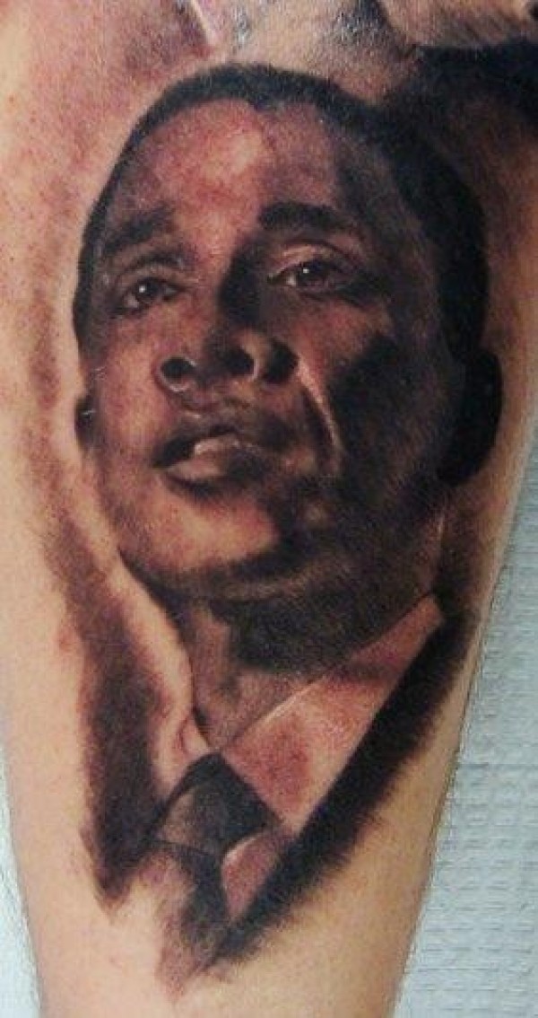 小腿黑灰风格年轻的奥巴马肖像纹身图案