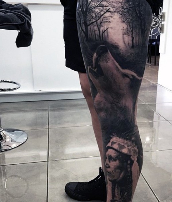腿部写实风格黑白森林狼和印度人像纹身图案