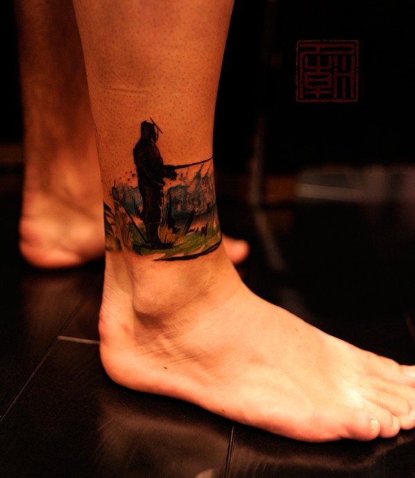 帅气的彩色花腿纹身水墨画纹身图案