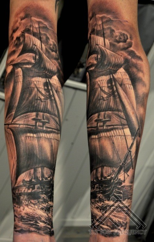 手臂黑白写实风格海盗船纹身图案