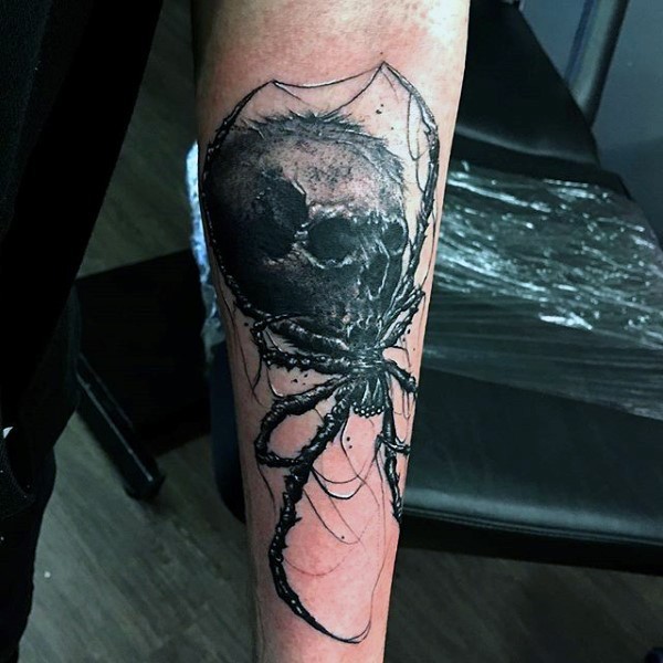 恐怖风格黑色蜘蛛与骷髅结合纹身图案