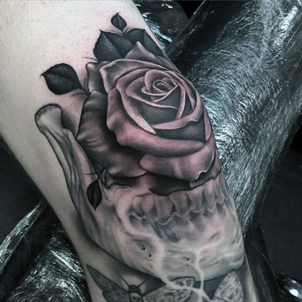 黑灰风格膝盖玫瑰与下颚骨纹身图案