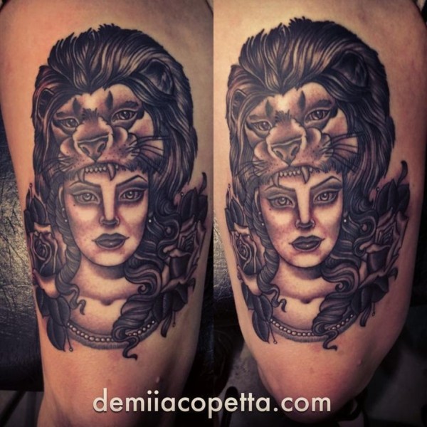 大腿惊人的黑色妇女与狮子头盔纹身图案