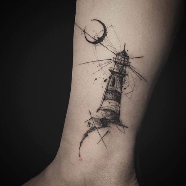 脚踝雕刻风格黑色灯塔和月亮纹身图案