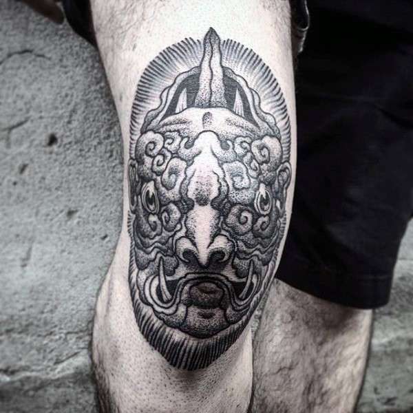膝盖雕刻风格黑色点刺恶魔头纹身图案