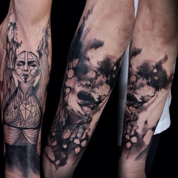 手臂黑灰风格神秘女人脸纹身图案