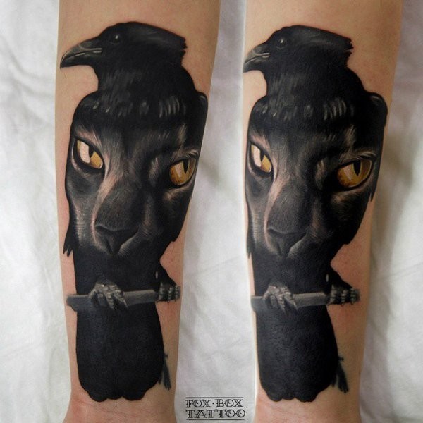 写实逼真创意的黑色乌鸦与猫脸纹身图案