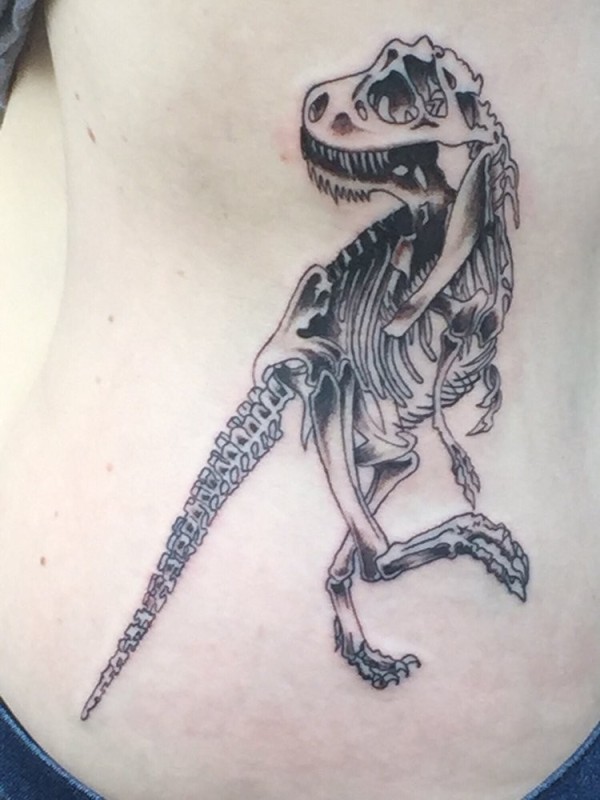 侧肋卡通风格黑色恐龙骨架纹身图案
