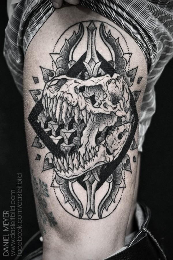 大腿old school黑色神秘恐龙头骨几何纹身图案