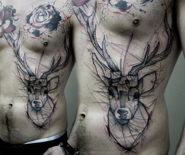 腰部素描风格黑色鹿头纹身图案